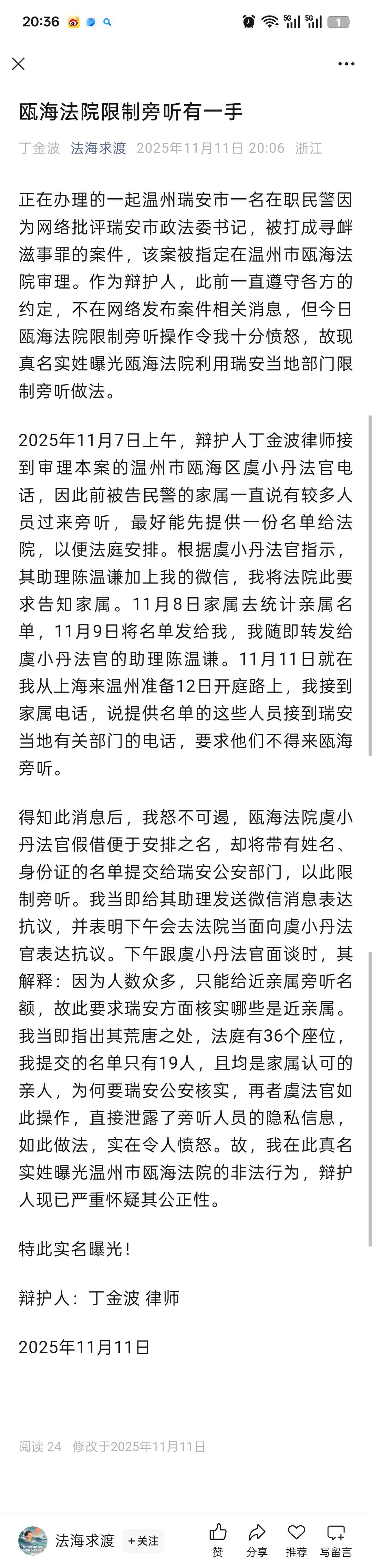 转于接手瑞安民警杨顺敏批评瑞安政法委书记,被打成寻衅滋事罪的丁律师的文章
