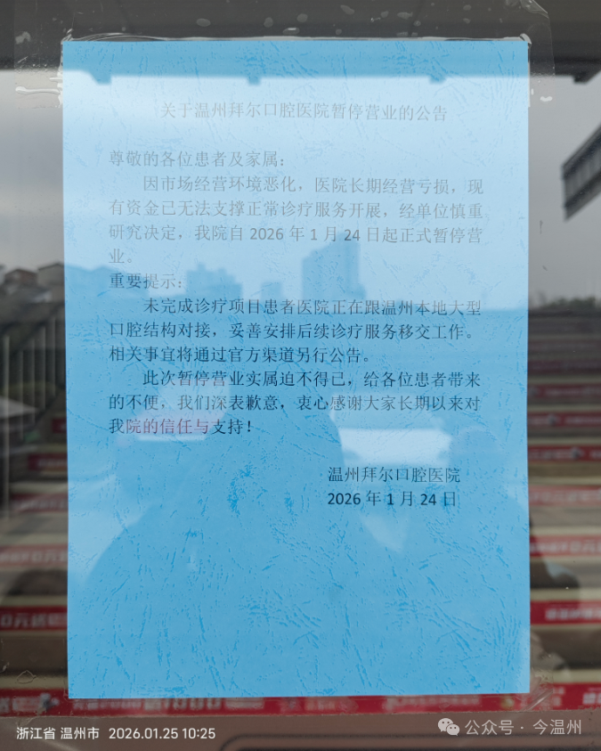 未完成诊疗项目患者医院正在跟温州本地大型口腔结构对接,妥善安排后续诊疗服务移交工作。相关事宜将通过官方渠道另行公告。