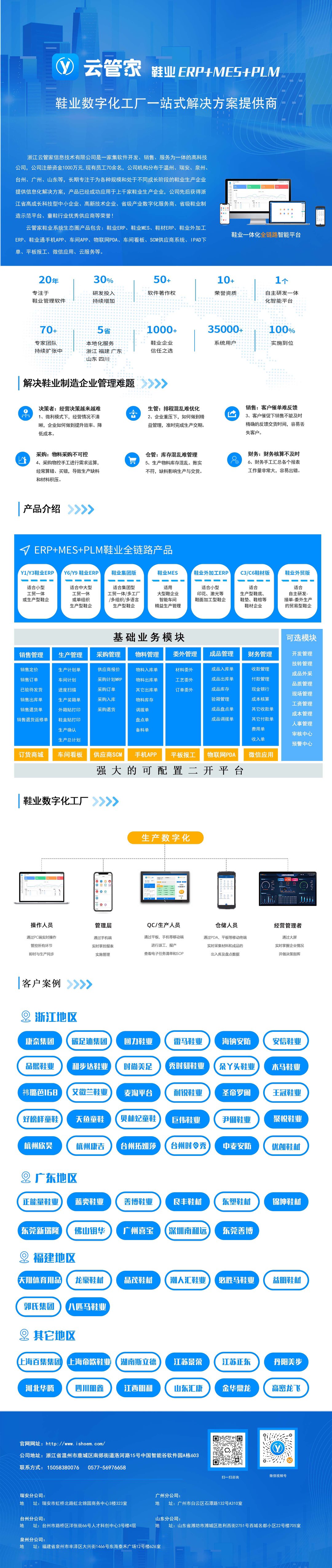【云管家软件】:云管家23年行业经验,是国内领先的鞋业行业软件提供商。云管家鞋业生产ERP已经成功能应用于1000多家鞋业生产企业,现有员工70多人,公司机构分布于温州、瑞安、泉州、台州、广州、山东。                               【云管家鞋业系统生态圈产品包含】:鞋业MES、鞋业ERP、鞋材ERP、鞋业外加工ERP、鞋业通手机APP、微信应用、物联网PDA、车间看板、SCM供应商系统、订货商城、平板报工、云服务等。
